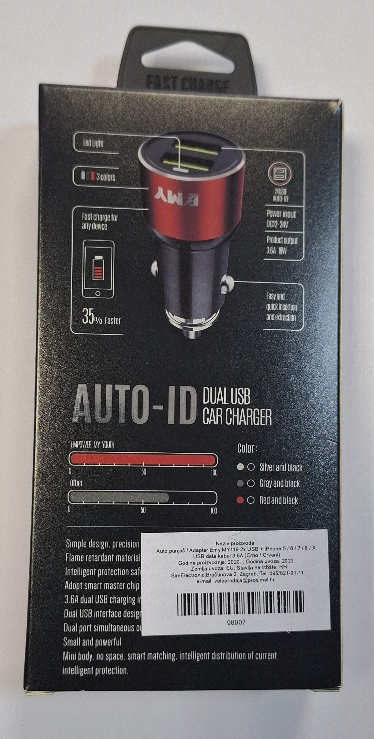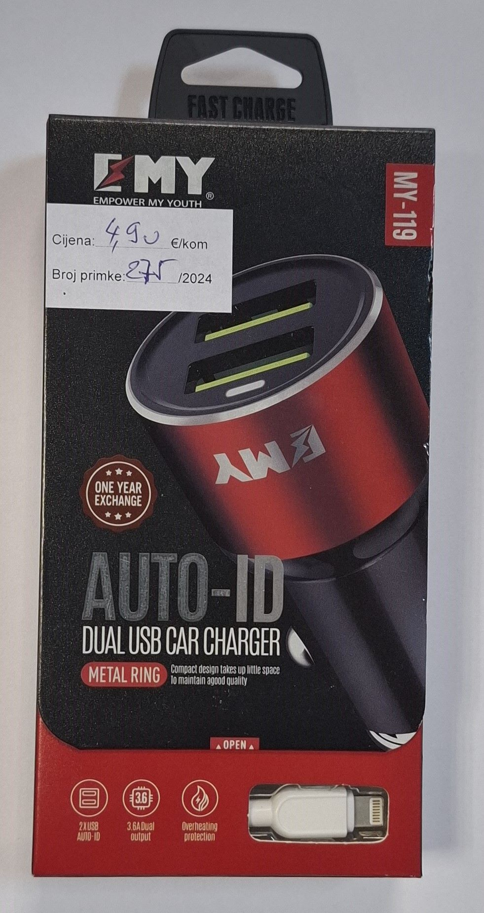 _ AUTOPUNJAČ USB EMY MY119 3,6A 2x + Iphone data kabel